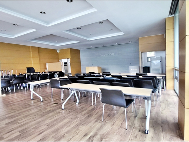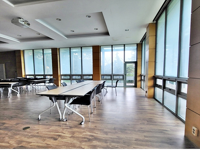 강의실로 사용되는 대강당과 식당용 주방설비되어 있는 주방, 로비 한쪽으로는 남/여 분리된 화장실 있음
