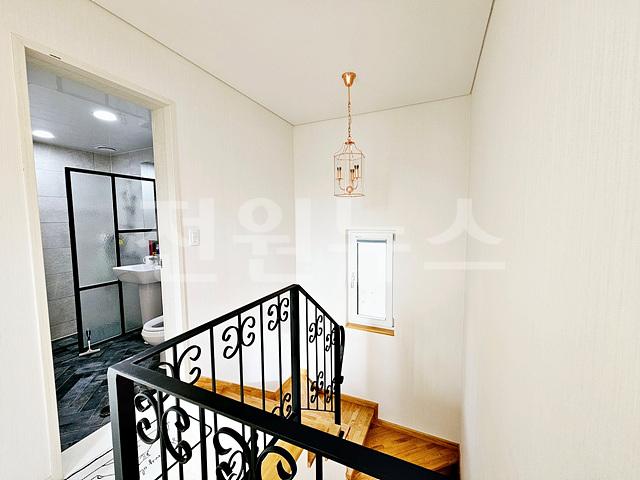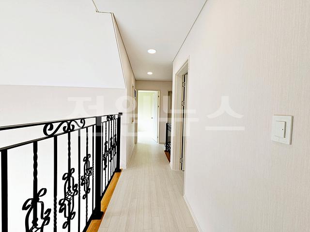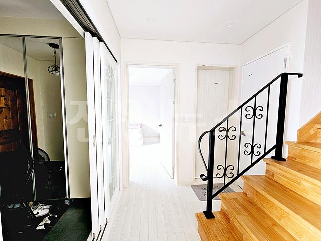 2층 방3개, 욕실1개, 복도난간 (1층 거실이 보임)