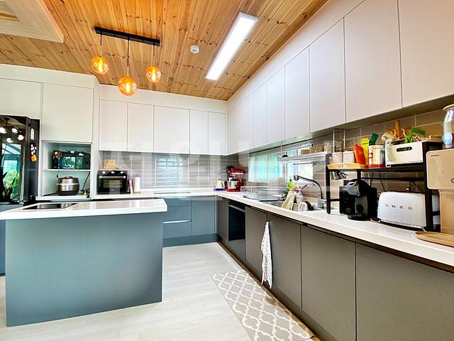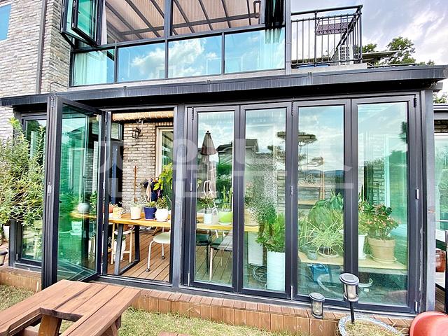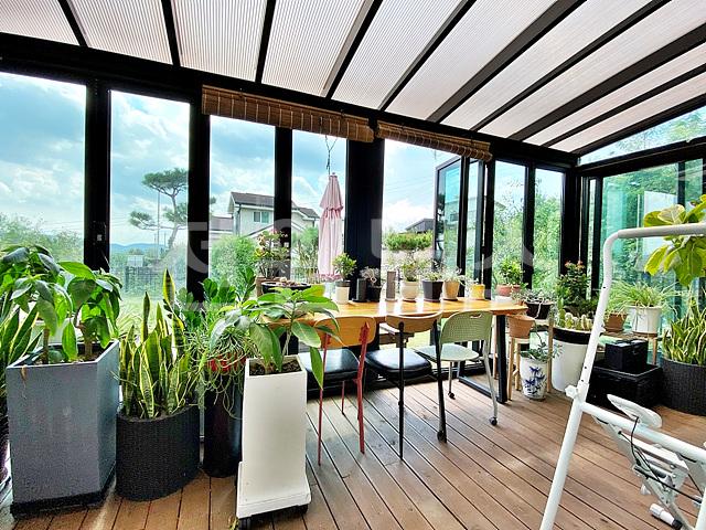 1층 거실창에서 연결된 썬룸 시공, 주방에서 연결된 다이닝 룸이 있어 확장된 공간감 있음