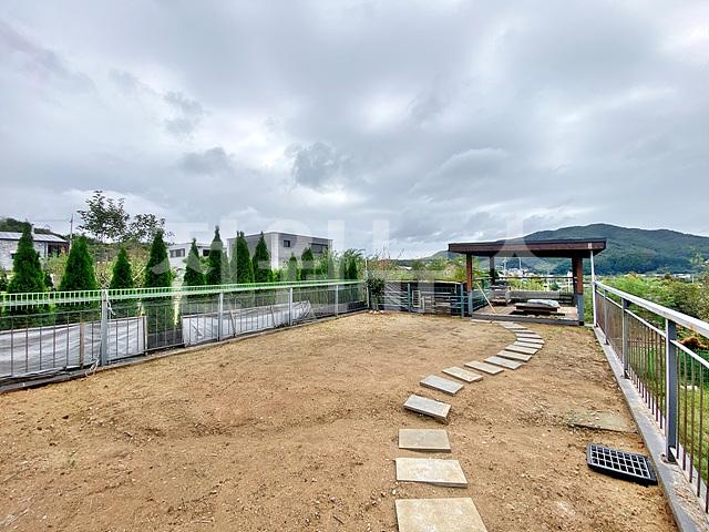 잔디밭, 관목류, 스틸난간프레임, 우드테크플로어