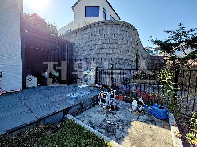 - 경계에 맞춘 보강토 공사, 평탄지 부지에 정원조경 되어 있음