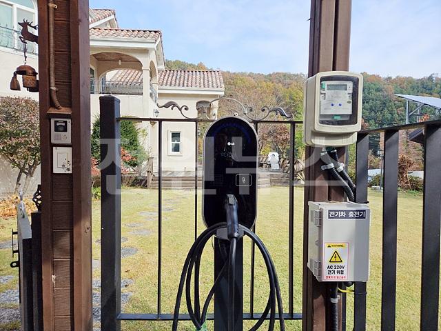입구 차고, 태양광 전기, 전기차 충전기 설치되어 있음
