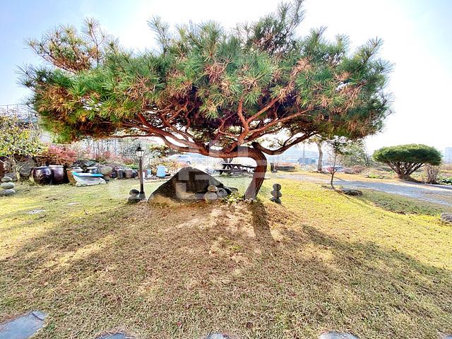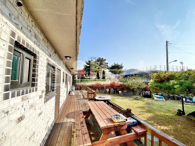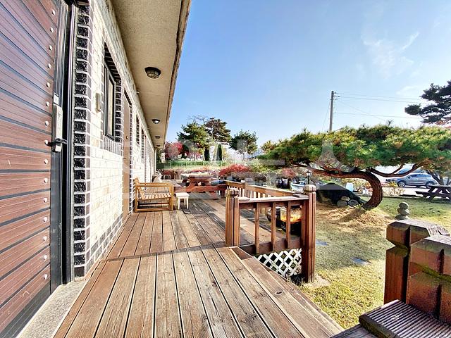 -잔디마당, 일부 주차공간 파쇄석 깔림, 정원수, 목재데크, 야외수전