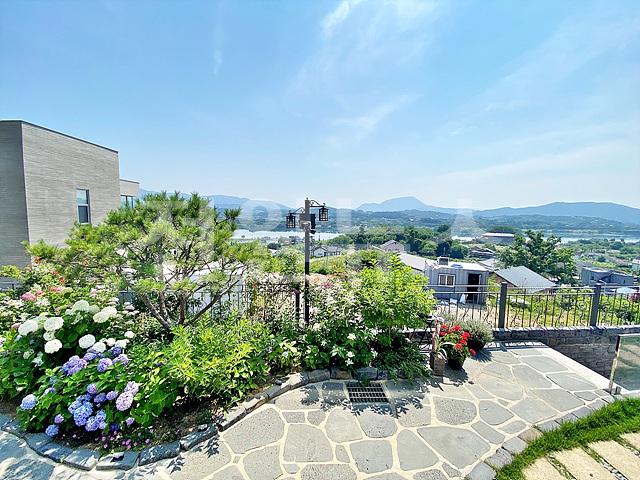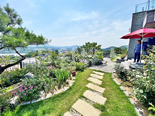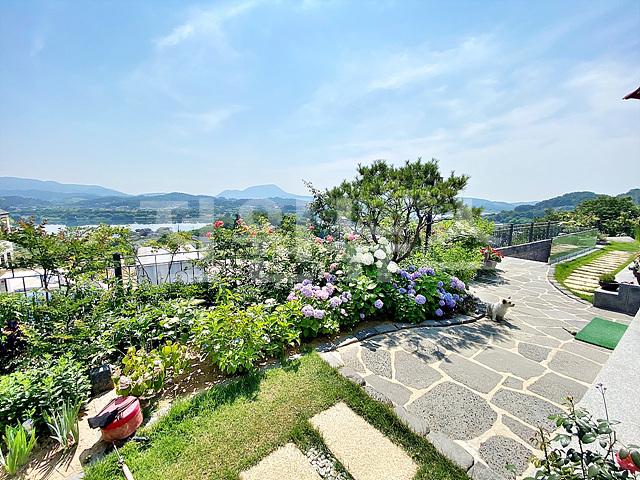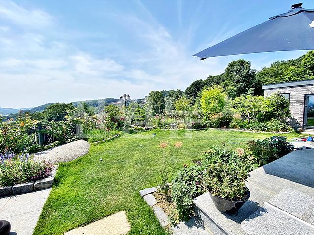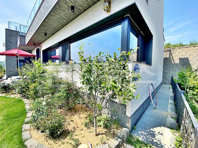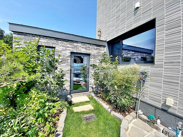 - 작은 잔디마당에 외부 수전 설치, 각종 정원수와 꽃나무로 조경되어 있음