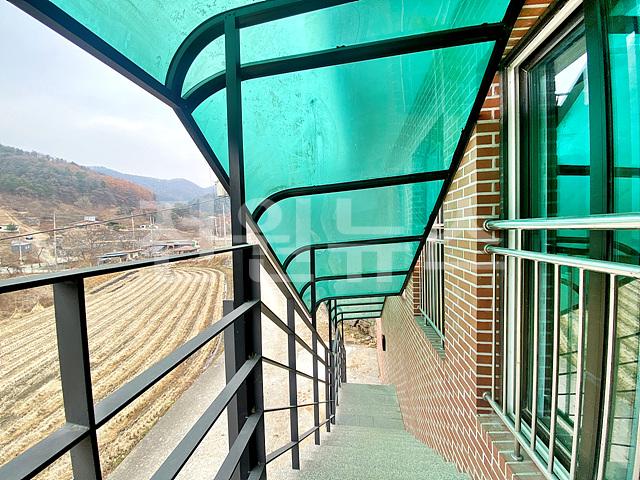 외부계단에 비가림 지붕 시공되어 있음