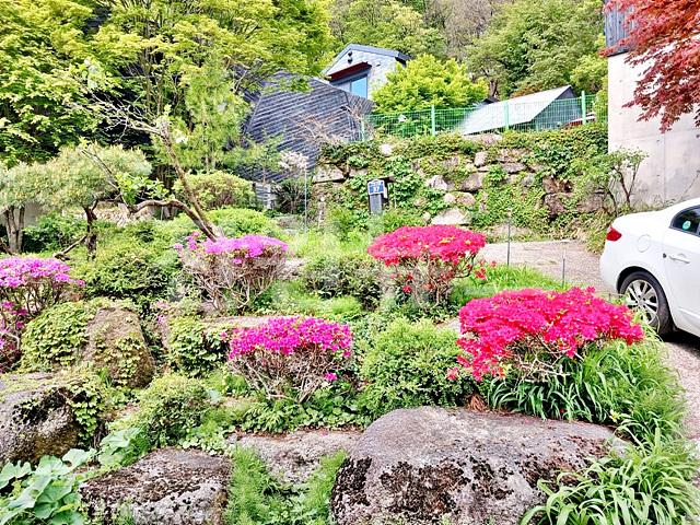 - 2단 지형, 조경석 토목, 아랫단 돌계단 및 주차박스 및 야외주차