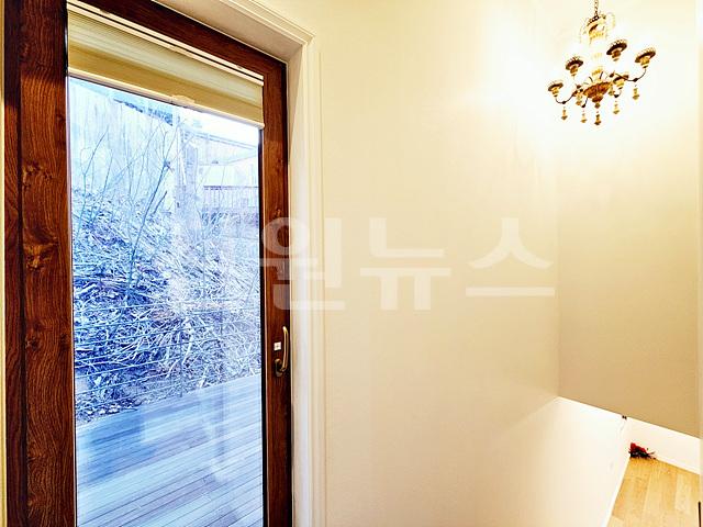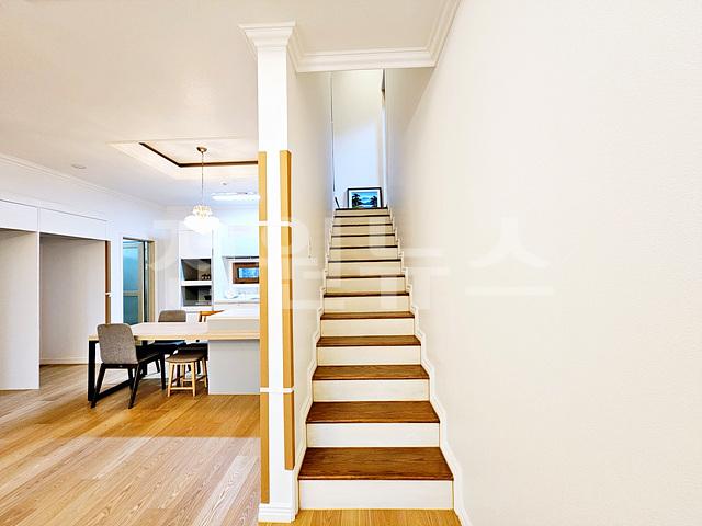 2층 올라가는 "ㄱ"계단, 계단 중간 1.5층 높이에 야외데크 출입문 있음