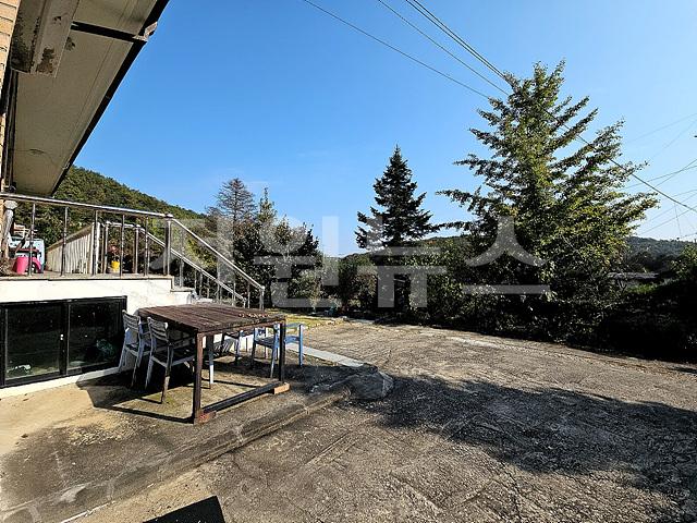 - 입구 시멘트 바닥 마당, 우측 정원 조경
