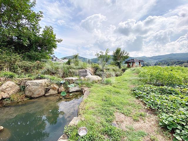 필지 서측으로 부분 경계수, 곳곳에 조경수 식재, 미니 연못&테이블 존,정자가 설치되어 있음