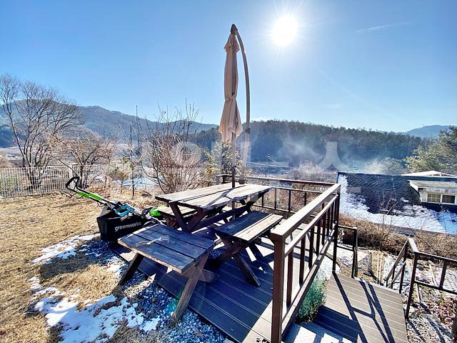 판석마감된 데크 상단에 어닝 설치되어 있음