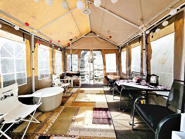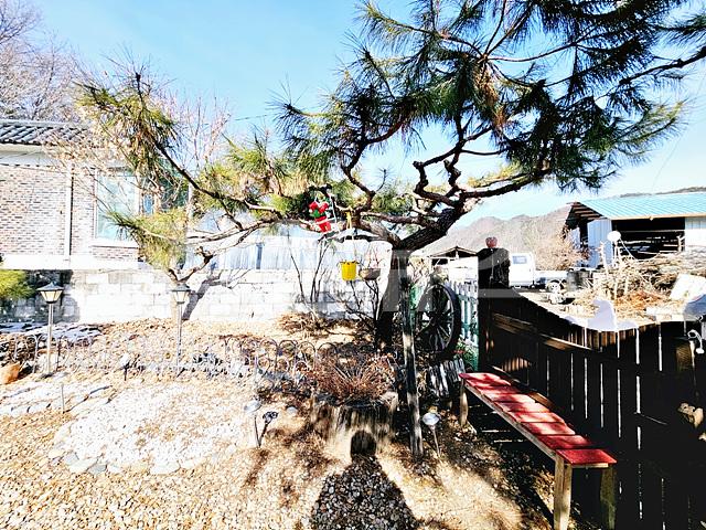 주택좌측 데크, 외부 천막텐트, 주택정면 소나무&잔디, 화단식 정원조경