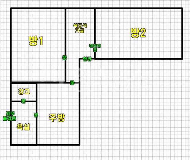 방2개, 복도식 거실, 주방, 욕실1개 (욕실안에 별도 창고공간)