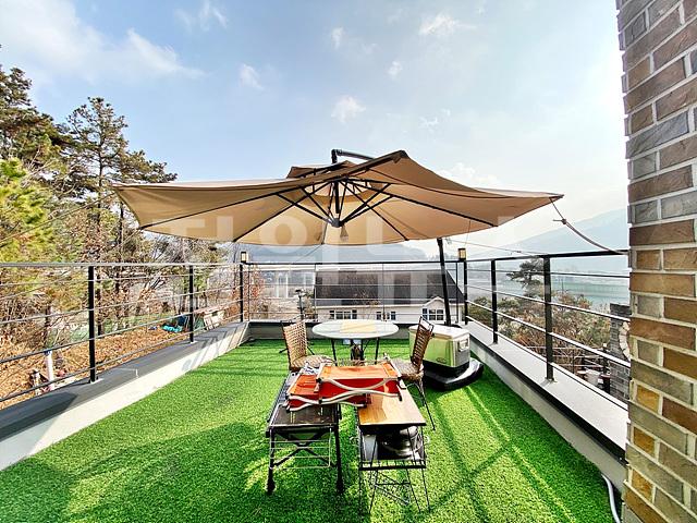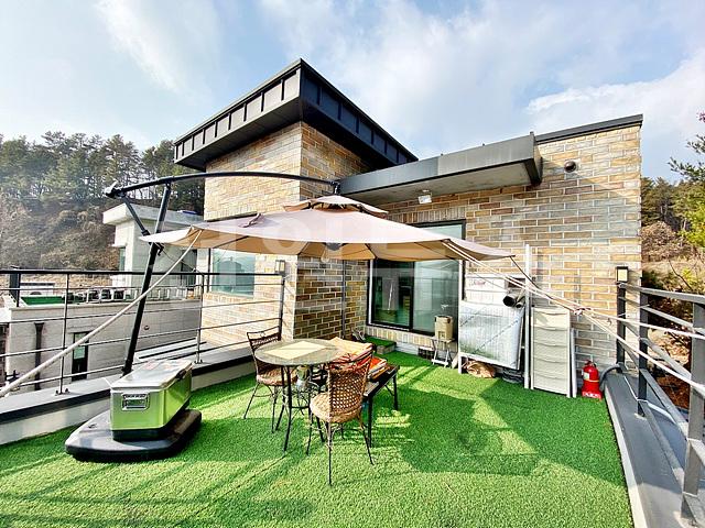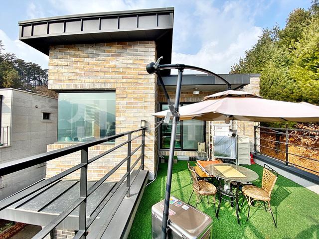 거실 앞 데크와 2층 테라스 공간에 인조잔디 깔려있음