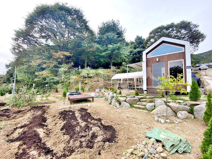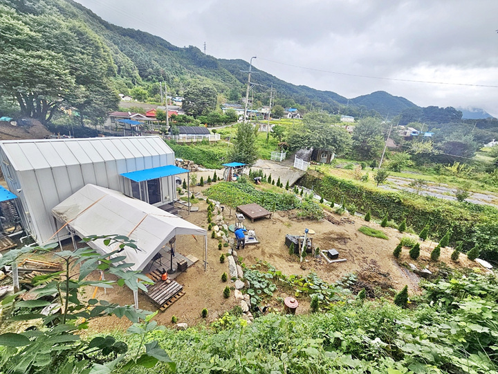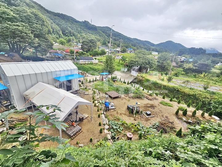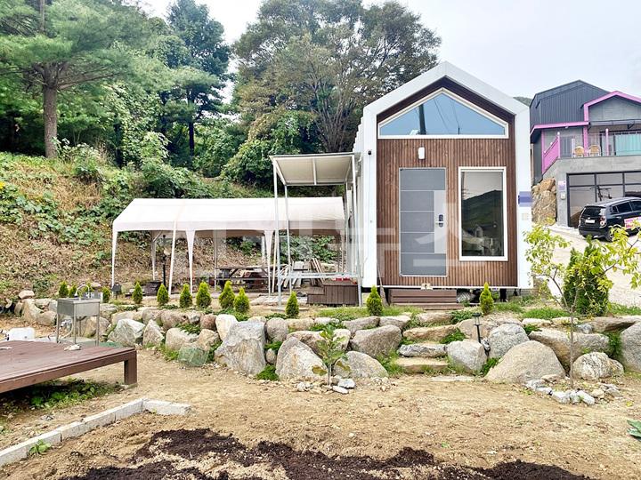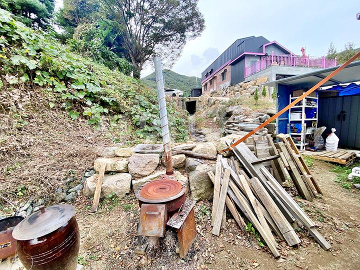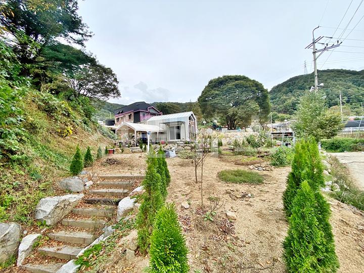 주택 마당과 천막 구역 사이 경계 조경석으로 단차 줌