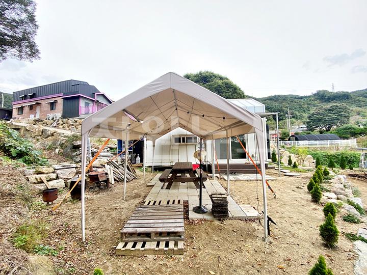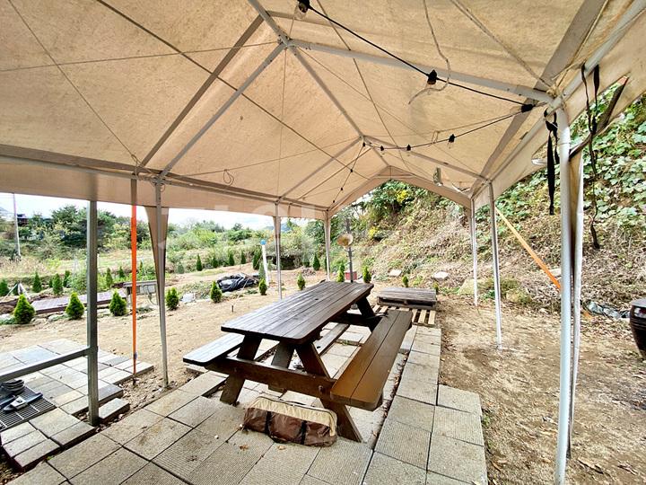 - 야외 정자형 천막 (우드 테이블 세트와 의자 배치)