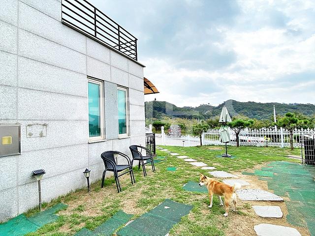 - 잔디마당, 디딤석, 조경수, 목재 데크, 철제휀스, 야외창고
