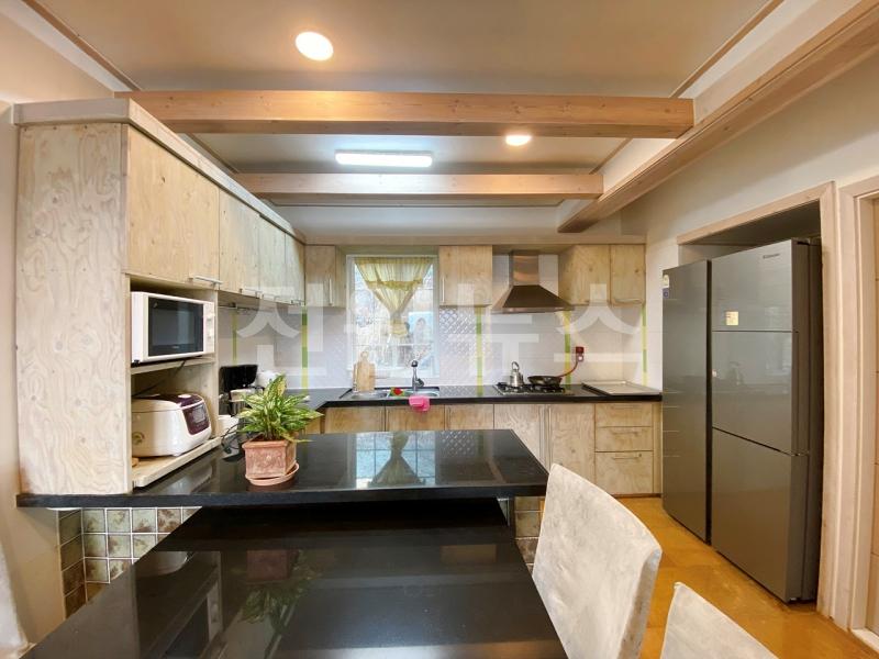 - 주방은 ㄷ자 구조이며 옆쪽에 다용도실이 있음.