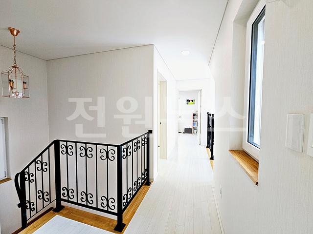 2층 방3개, 욕실1개, 복도난간 (1층 거실이 보임)