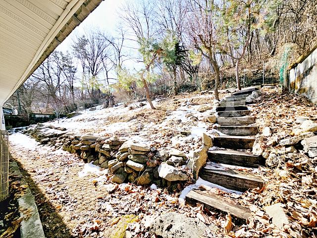 - 전체 2단 지형의 필지 ( 주택부지 및 정원조경, 뒷마당 완경사 자연 지형)