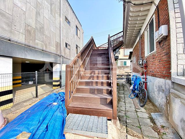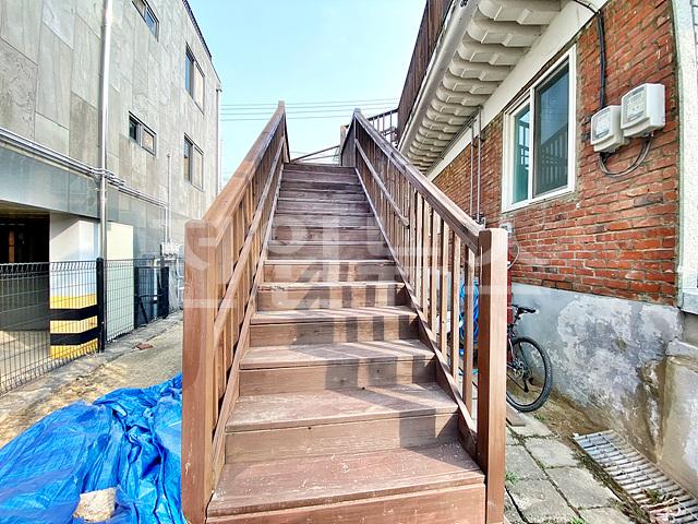2층은 외부 목재 계단통해 올라가며, 현관앞 테크공간 있음