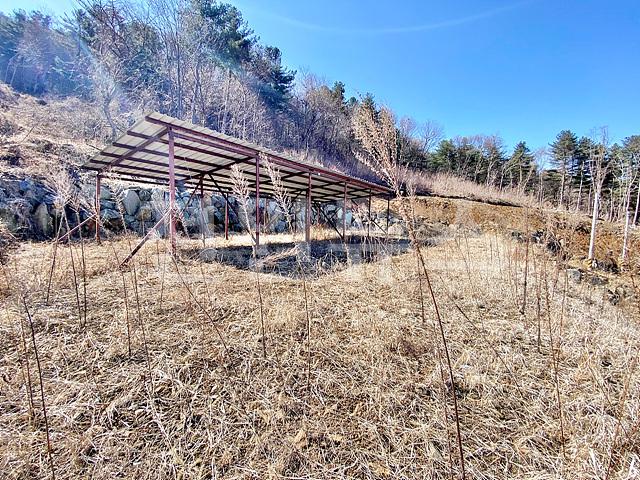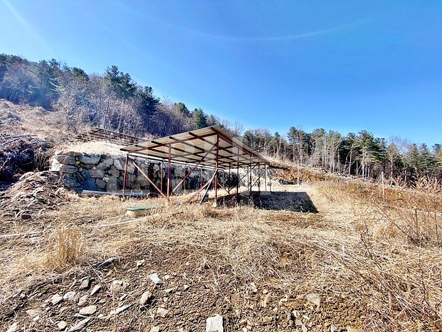 필지 안에 기둥과 지붕 구조만 남아있는 구조물이 2개 있음